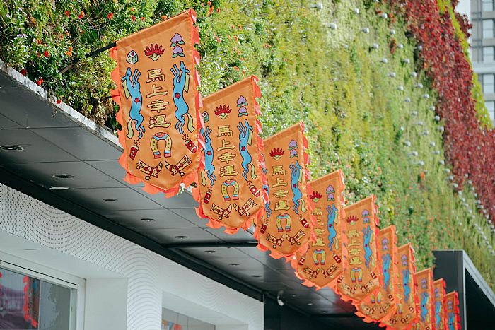設計上大膽翻玩春節慶典中隨處可見的「錦旗」元素,重新拆解其結構與排列方式,以傳統刺繡工藝搭配高飽和潮流色彩,形塑出一幅充滿動能的「馬上幸運」畫面。
