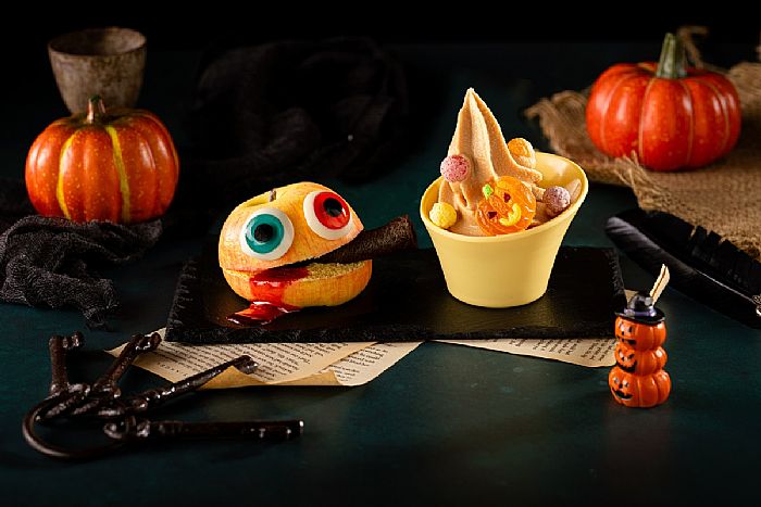 10/17-10/31消費任一套餐,加價59元就能擁有萬聖節限定甜點組合「蘋果鬼鬼和霜淇淋」。紅豆包假扮成蘋果,張著軟糖大眼,嘴裡叼著巧克力捲心酥,旁邊還流著草莓醬假血,與黑糖霜淇淋一同上桌搞怪,吸睛造型將成打卡新寵。10/29-10/31,限時3天,國小以下孩童內用再送萬聖節主題氣球,數量有限,送完為止,家長們趕緊記下時間,和寶貝一同感受萬聖節的歡樂氛圍。