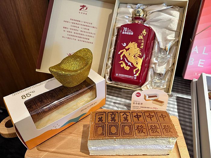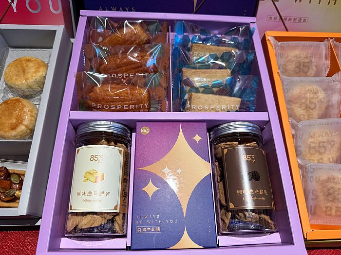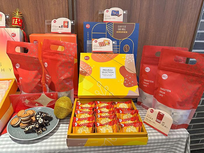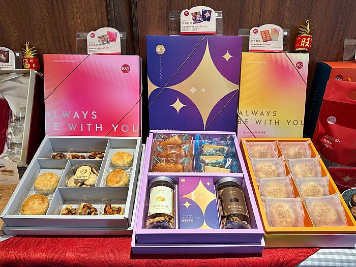 今年9款年節禮盒,外盒以簡約和科技感為核心,透過俐落的幾何線條與層次配色,勾勒出低調卻充滿未來感的視覺,在傳統節慶氛圍中注入創新氣息。禮盒特別強調豐盛感與分享性,內容橫跨中西式烘焙點心,分別為「福韻迎春綜合禮盒」、「甜蜜鬆果綜合禮盒」、「福桂雙喜綜合禮盒」、「肉鬆麻糬酥餅禮盒」、「鳳梨酥禮盒」、「經典咖啡蛋捲禮盒」、「特濃牛軋糖」、「GOLDEN一路發長條蛋糕」、「媽祖酒廠建廠70周年紀念酒」,1/15起到3/3日至85℃全台門市,預購指定禮盒即享85折,另外購買禮盒即加送紅包袋 (數量有限、送完為止)。