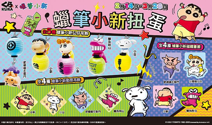 藏壽司再次召喚小新宇宙,動感光波全面噴射,一口氣端出滿滿動感的聯名扭蛋驚喜!集結三大系列共 13 款角色扭蛋,將於 2 月 14 日正式開扭。小新、小葵、鱷魚阿山、小白、肥嘟嘟左衛門等人氣經典角色齊聚登場,公仔吊飾此次首度加入人見人愛的小葵角色,萌度破表,小「新」一扭再扭!