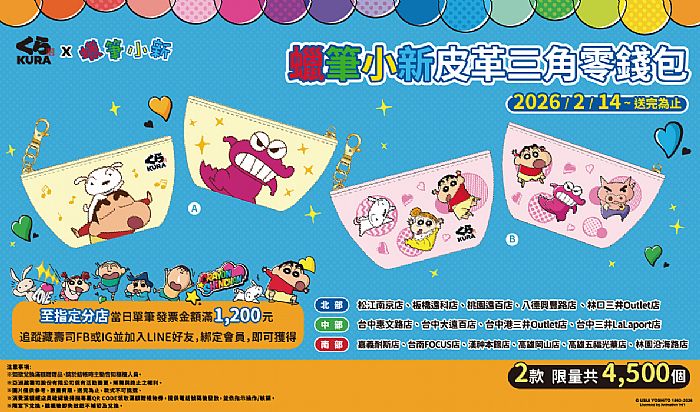 你回來了!迎接 2026 初春到來,藏壽司再度攜手日本超人氣漫畫蠟筆小新推出話題滿滿的聯名企劃,自 2 月 14 日起,集結三大系列共 13 款超人氣角色扭蛋正式開扭,首度推出聯名壓縮旅行袋組及不鏽鋼吸管杯加價購;更加碼推出15店限定活動,滿額贈小新零錢包,特色聯名店,拍照打卡還有機會抽中療癒系絨毛抱枕。