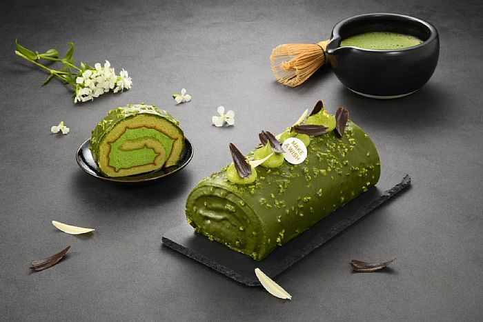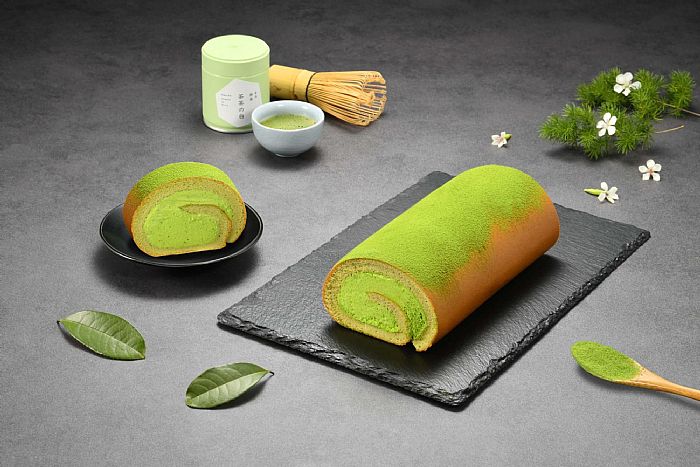 華麗系脆皮生乳捲—「宇治抹茶脆皮巧克力生乳捲」使用奶香濃郁的比利時白巧克力披覆在泡芙蛋糕上,形成獨有華麗的脆皮造型與口感,點綴朵朵抹茶奶霜與巧克力片,猶如走入京都風華的優雅中、儀式感爆棚。