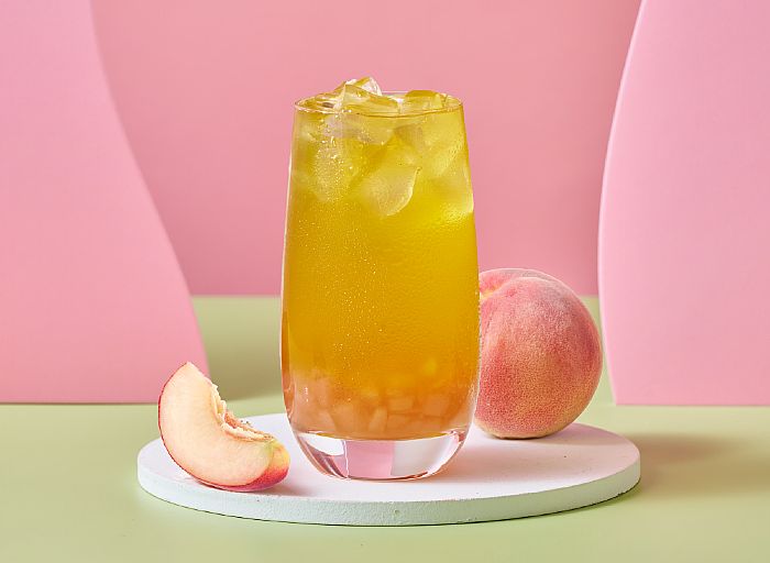 以茶感較重的四季春茶為基底,清甜爽口、能咬得到水蜜桃果肉!