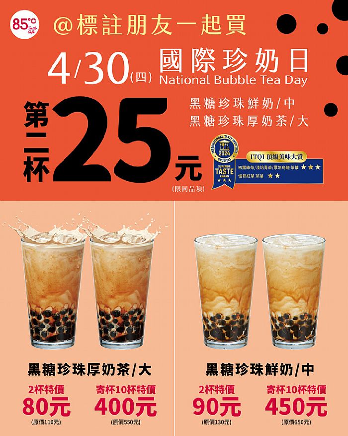 4月30日「國際珍奶日」要來了,身為手搖控真的沒有理由不喝一波!每年這一天,各大品牌都會推出限定優惠,而今年85℃也不手軟,直接祭出人氣黑糖珍珠系列「第二杯只要25元」的超狂活動,根本是在逼大家揪團開喝。