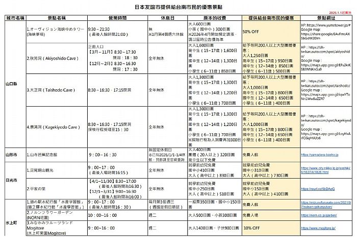 市府新聞及國際關係處表示,第一波共有日本山口縣、山形市、日光市、水上町、宇土市、別府市、宇佐市開放共計28個景點提供臺南市民專屬門票優惠(景點名稱與優惠內容請隨時參見市府公告)。